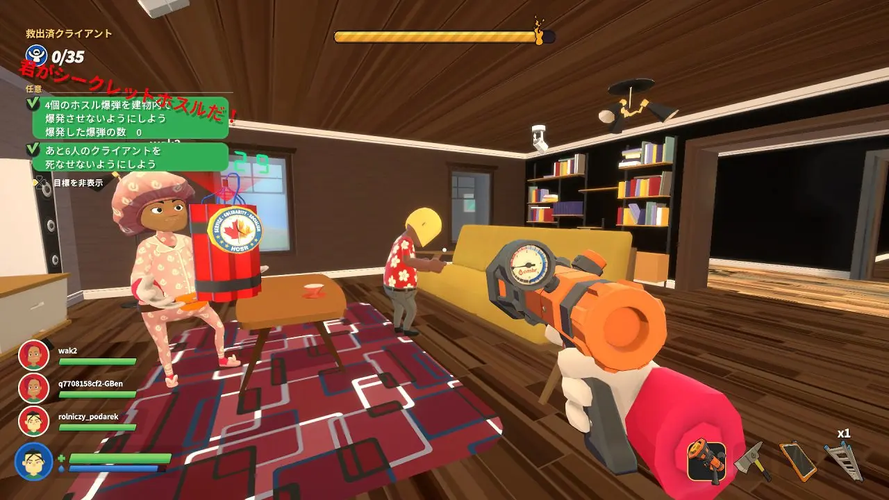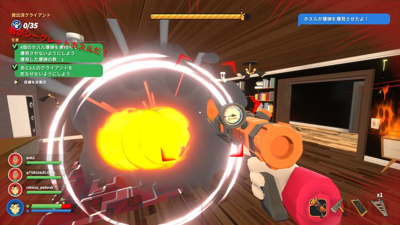 4人用オンラインプレイモードで制限時間内に火災現場からクライアントを救助しよう!チームの中の1人はライバル企業ホスルのスパイだ!一定時間経過後、怪しい動きをしていたチームメイトに投票し、裏切り者を見つけ出そう。スパイとなったプレイヤーは、自分がスパイだと気が付かれないようにチームメイトの足を引っ張りながら彼らのミッション失敗を目指します。