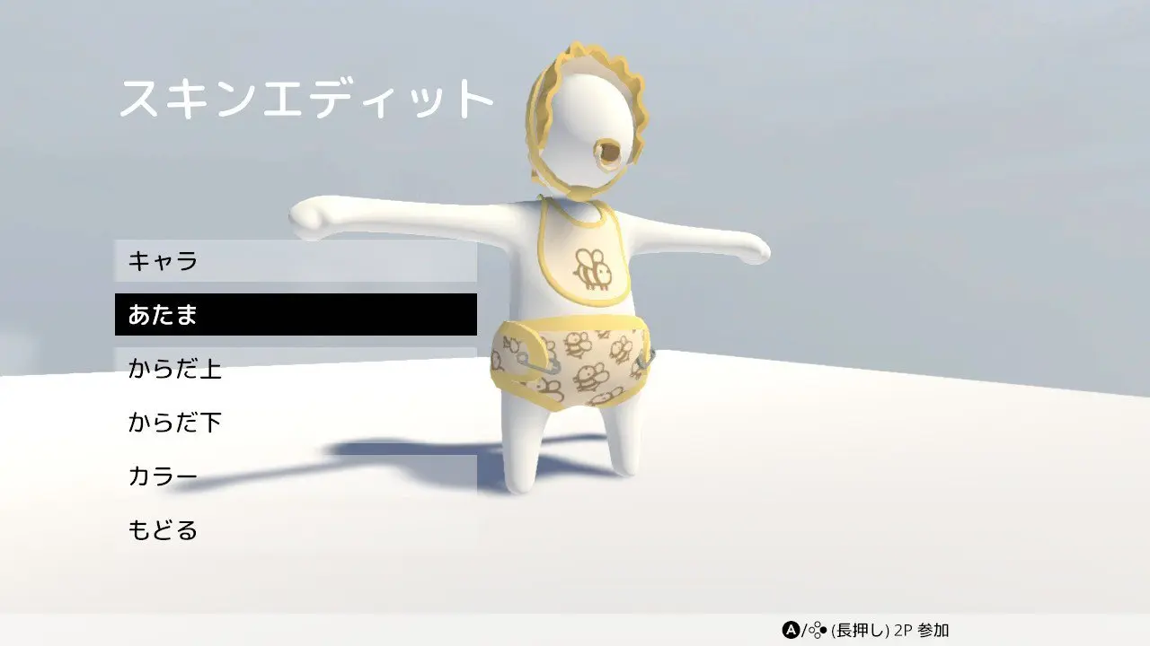 ミツバチが描かれた赤ちゃんに持ってこいのオムツとヨダレかけが特徴のスキンです。 帽子とおしゃぶりを装備してLet‘sふにゃふにゃ!