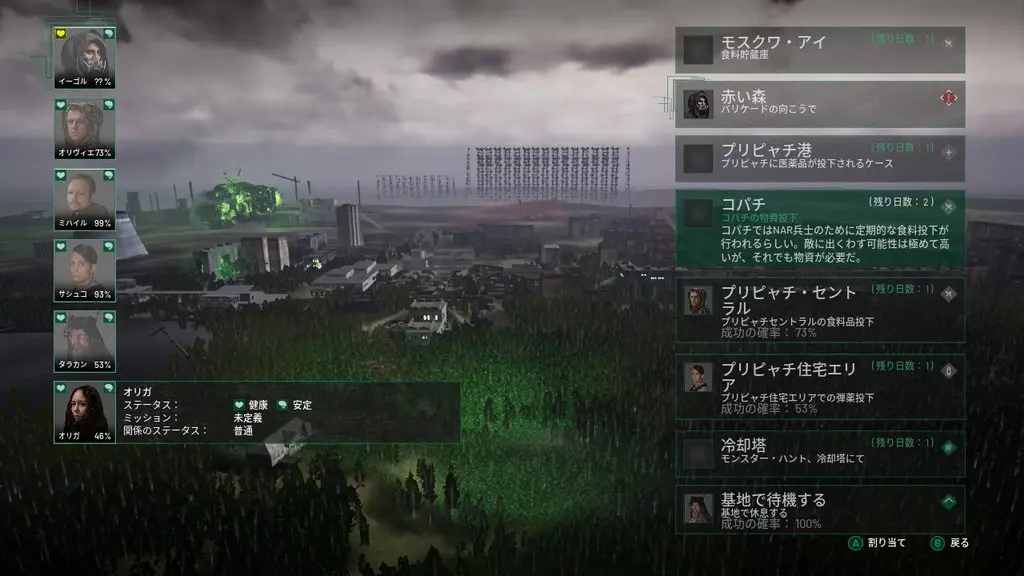 仲間たちの生存は、自分自身の生存を意味する。そして彼らの存在は、目的の達成に欠かせない。頼れるリーダーとして、拠点に必要な物資を見極めて仲間たちの任務を堅実に計画し、タスクを慎重に割り当てることが求められる。入手した食料や医療品を必要とする仲間に配給して、心身ともに夜間を乗り越えることが重要だ。