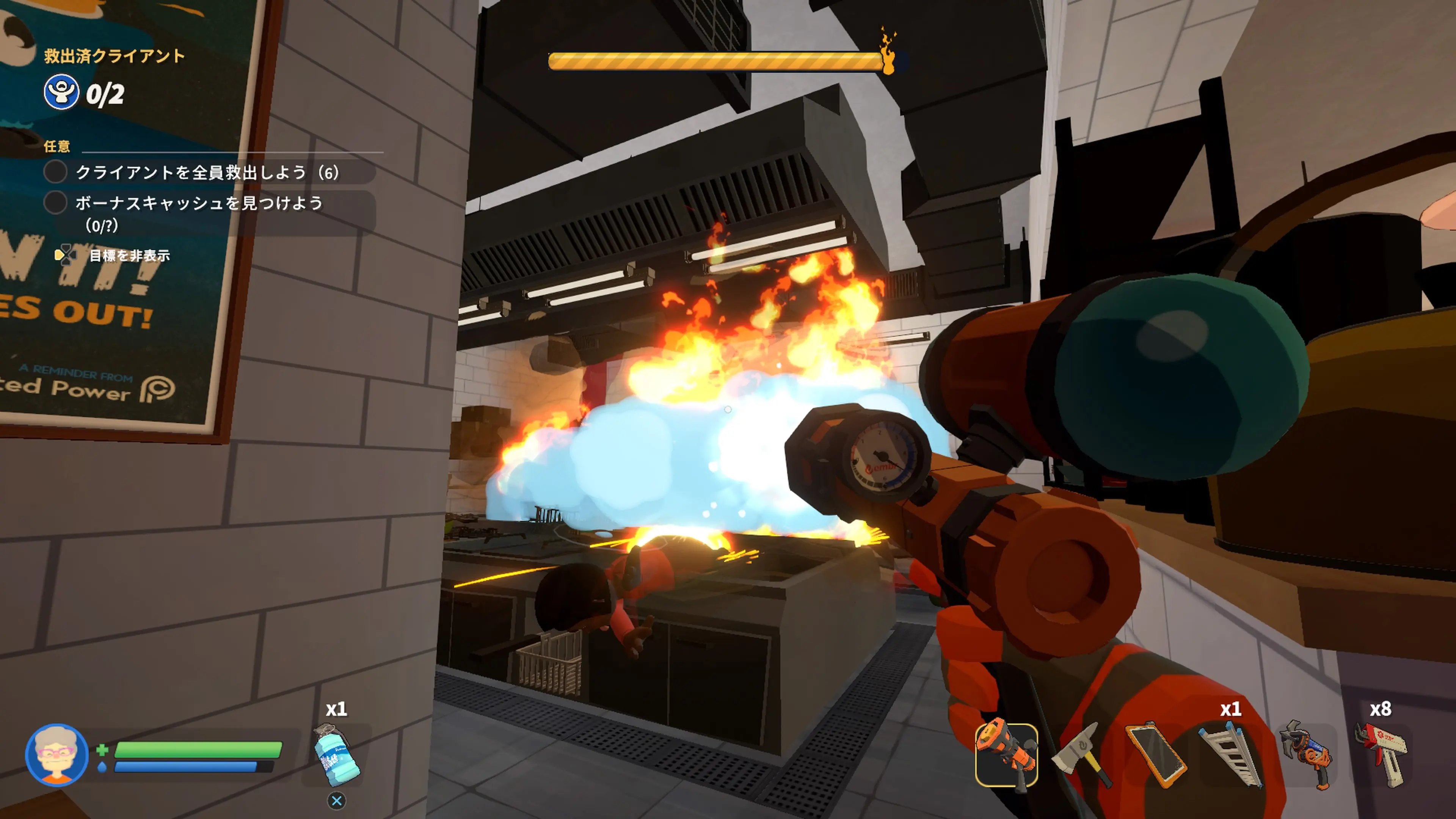 4人用オンラインプレイモードで制限時間内に火災現場からクライアントを救助しよう!チームの中の1人はライバル企業ホスルのスパイだ!一定時間経過後、怪しい動きをしていたチームメイトに投票し、裏切り者を見つけ出そう。スパイとなったプレイヤーは、自分がスパイだと気が付かれないようにチームメイトの足を引っ張りながら彼らのミッション失敗を目指します。